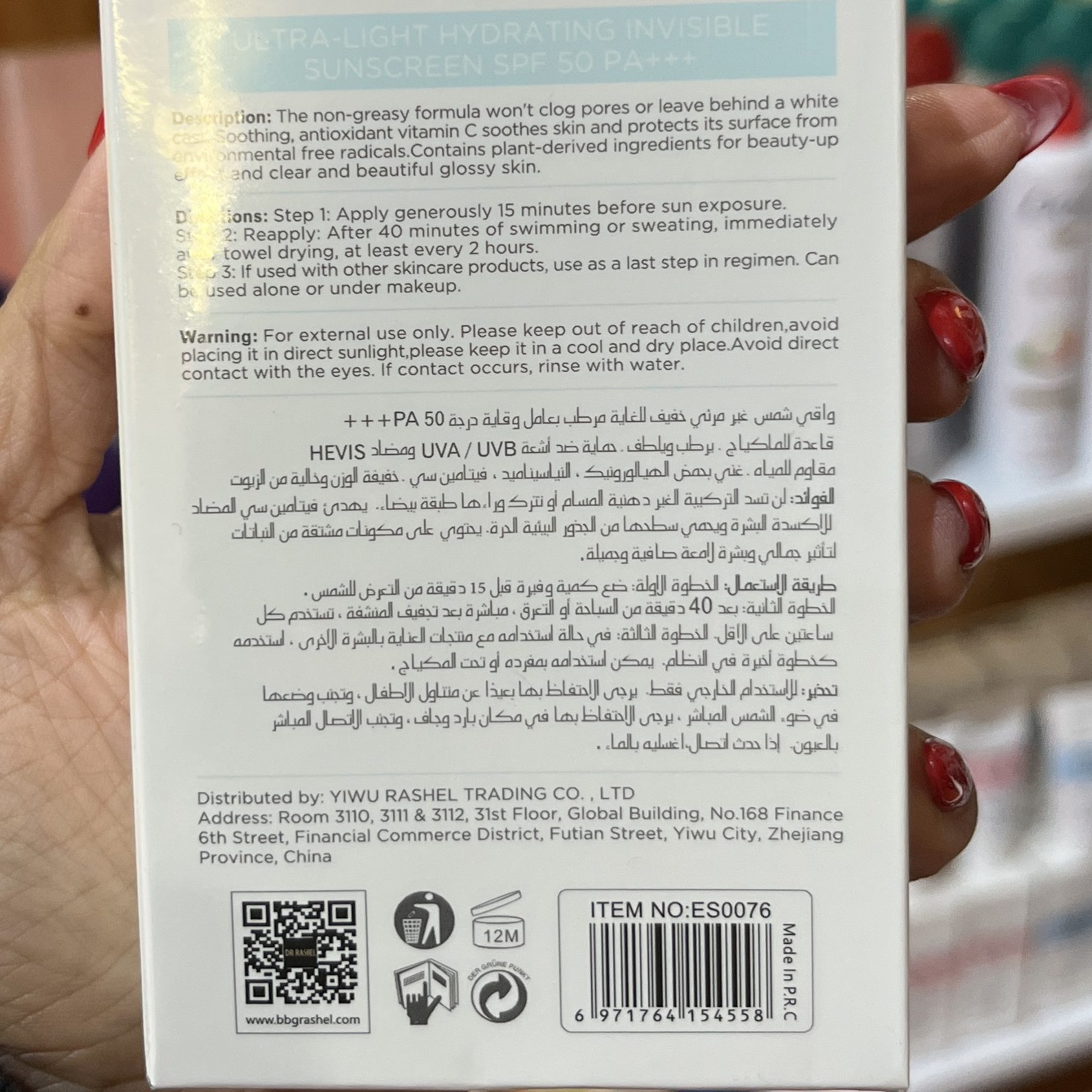 این نسخه ۵۰ گرمی با SPF50 و فرمت «بیرنگ / invisible» تولید شده تا برای انواع پوست و بعنوان بیس زیر آرایش ایدهآل باشد. اندازه ۵۰ گرم برای همراهی روزانه و سفر مناسب است.